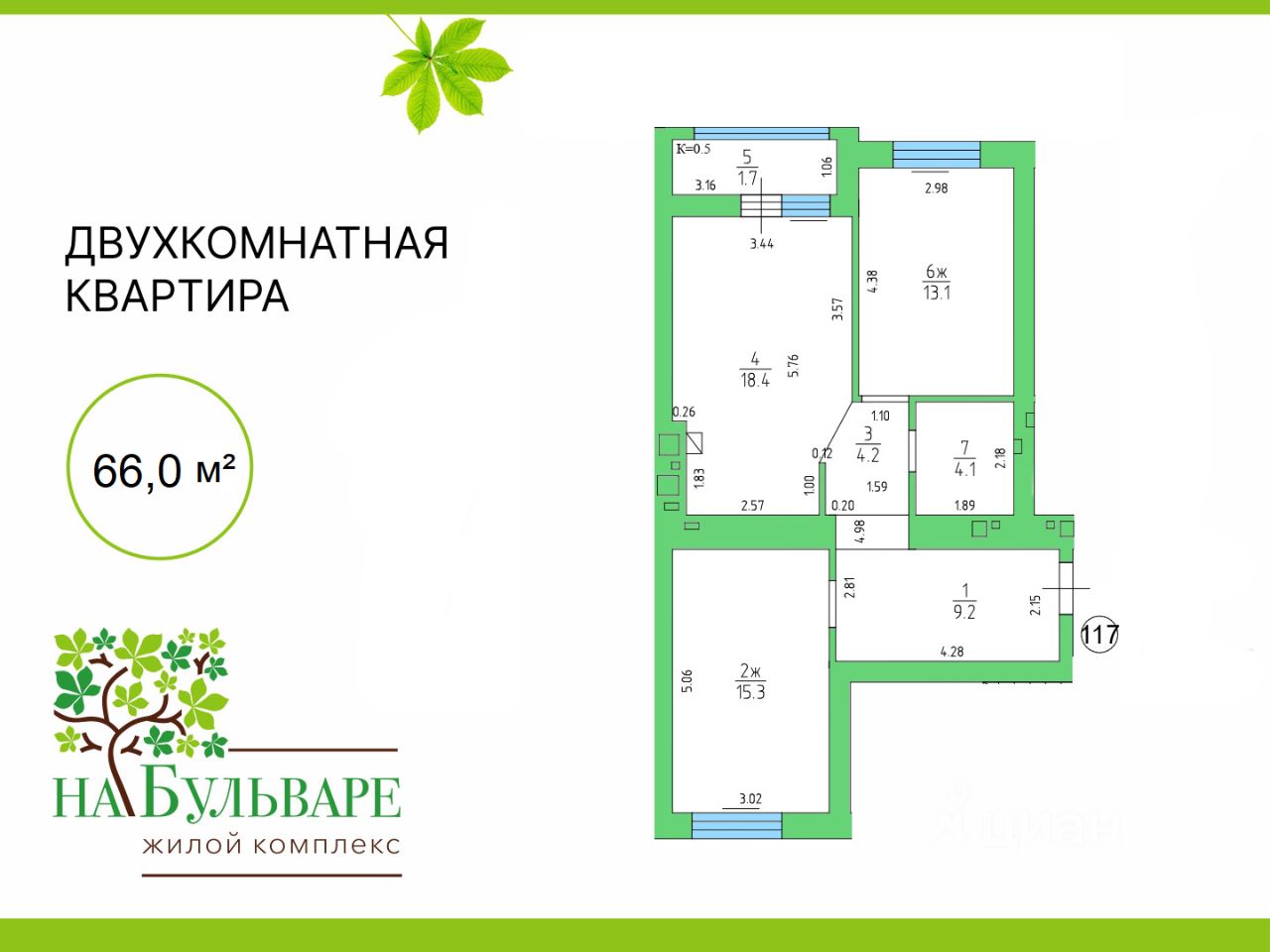 Продаётся 2-комнатная квартира в строящемся доме (Дом 1), срок сдачи: IV-кв. 2025, общей площадью 65.86 кв.м., на 2 этаже.