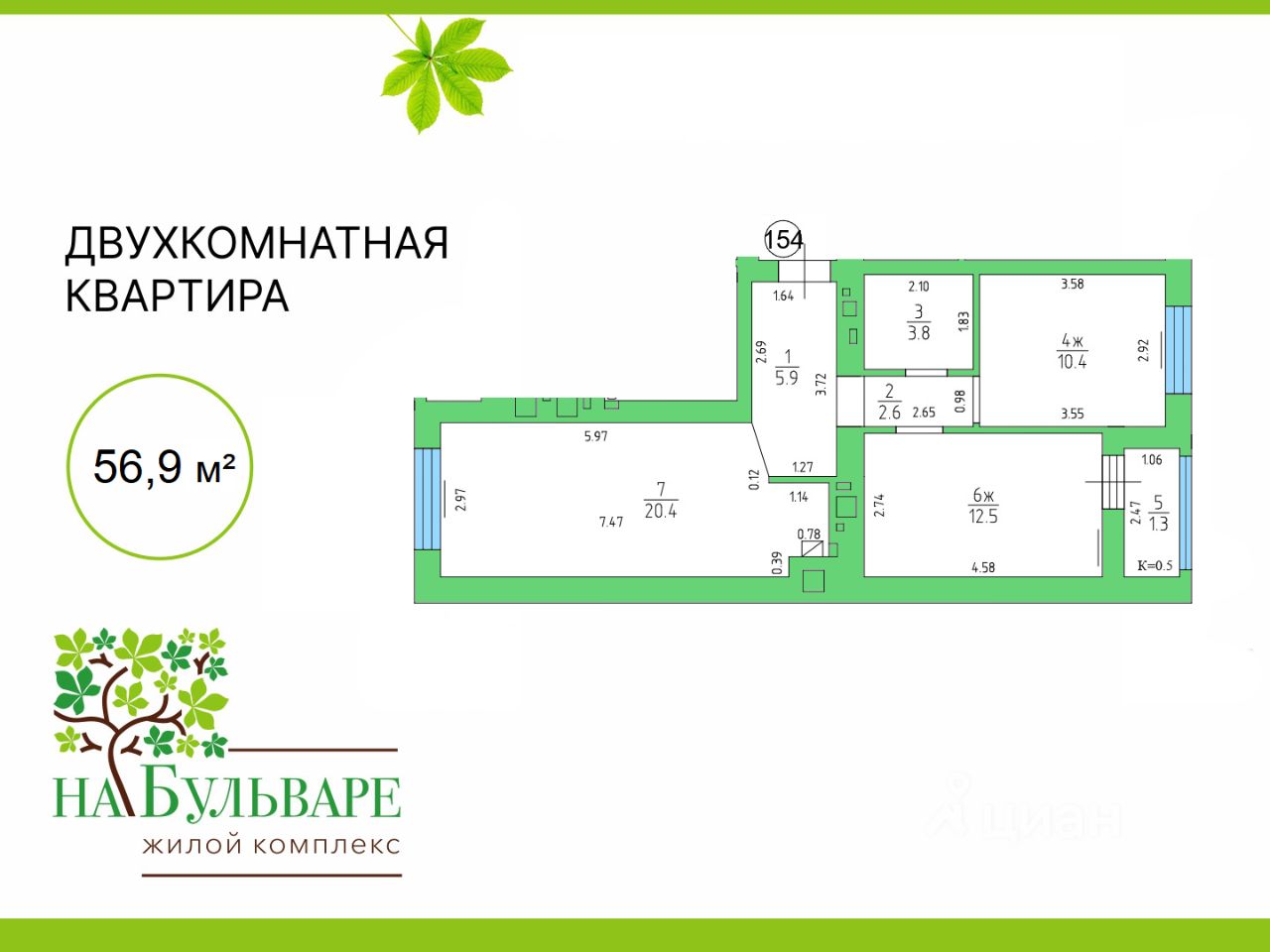 Продаётся 2-комнатная квартира в строящемся доме (Дом 1), срок сдачи: IV-кв. 2025, общей площадью 57.31 кв.м., на 6 этаже.