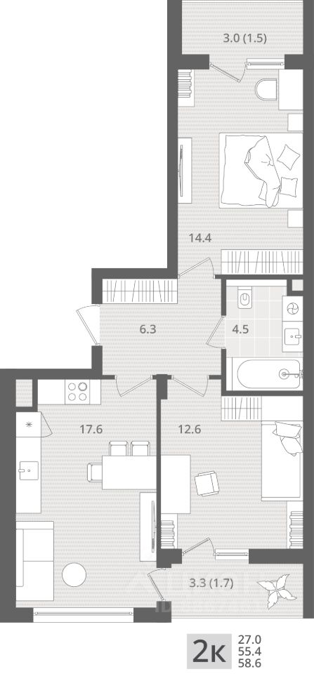 Продаётся 2-комнатная квартира в строящемся доме (Дом 1.1), срок сдачи: IV-кв. 2026, общей площадью 58.6 кв.м., на 1 этаже. Новый жилой комплекс "МОре" от Строительной компании "Меркурий" расположен по адресу: Калининградская область, г. Пионерский, пос. Рыбное.