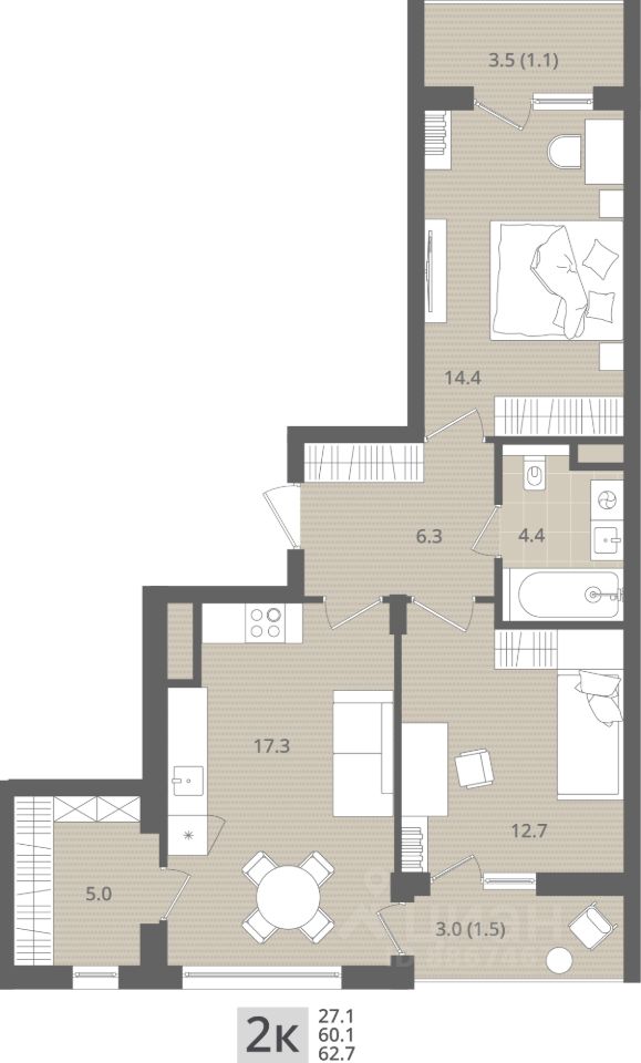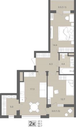 Продаётся 2-комнатная квартира в строящемся доме (Дом 1.1), срок сдачи: IV-кв. 2026, общей площадью 62.7 кв.м., на 6 этаже. Новый жилой комплекс "МОре" от Строительной компании "Меркурий" расположен по адресу: Калининградская область, г. Пионерский, пос. Рыбное.