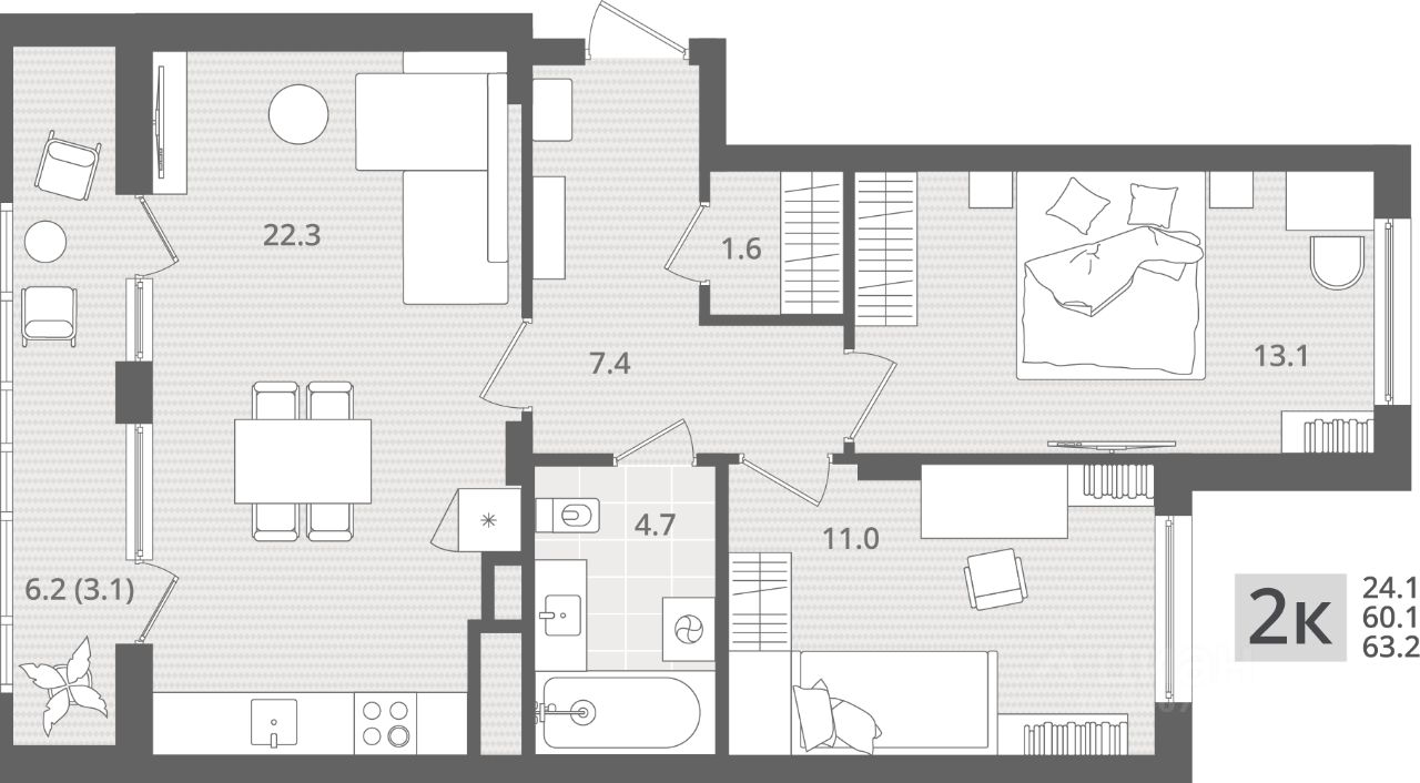 Продаётся 2-комнатная квартира в строящемся доме (Дом 1.1), срок сдачи: IV-кв. 2026, общей площадью 63.2 кв.м., на 3 этаже. Новый жилой комплекс "МОре" от Строительной компании "Меркурий" расположен по адресу: Калининградская область, г. Пионерский, пос. Рыбное.