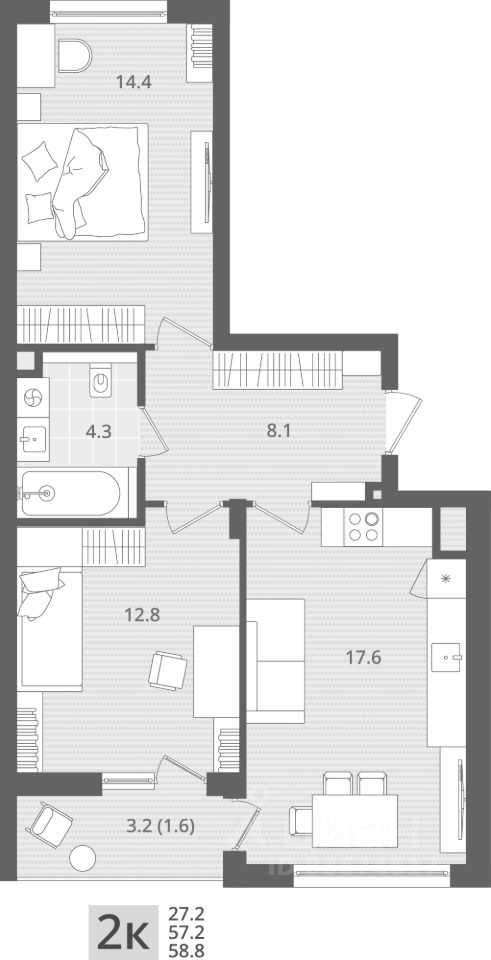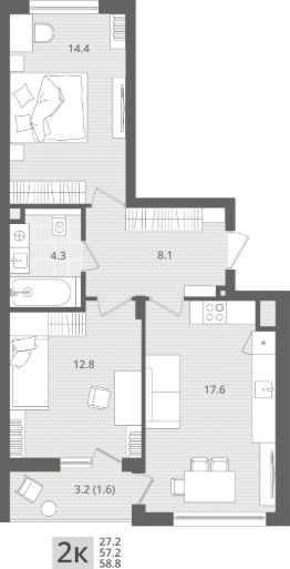 Продаётся 2-комнатная квартира в строящемся доме (Дом 1.2), срок сдачи: IV-кв. 2026, общей площадью 58.8 кв.м., на 1 этаже. Новый жилой комплекс "МОре" от Строительной компании "Меркурий" расположен по адресу: Калининградская область, г. Пионерский, пос. Рыбное.