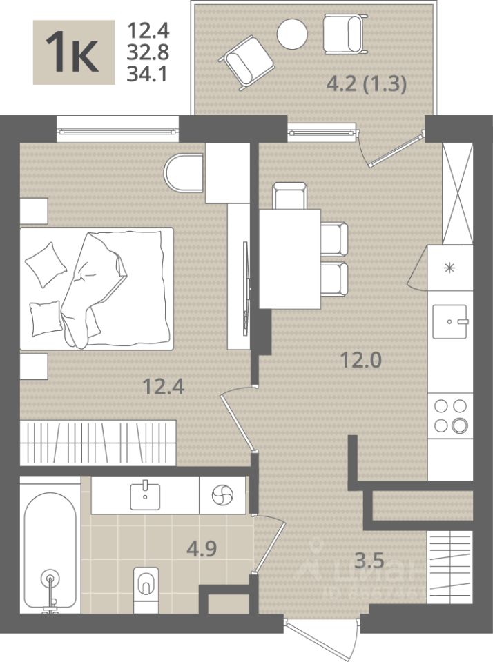 Продаётся 1-комнатная квартира в строящемся доме (Дом 1.2), срок сдачи: IV-кв. 2026, общей площадью 34.1 кв.м., на 5 этаже. Новый жилой комплекс "МОре" от Строительной компании "Меркурий" расположен по адресу: Калининградская область, г. Пионерский, пос. Рыбное.