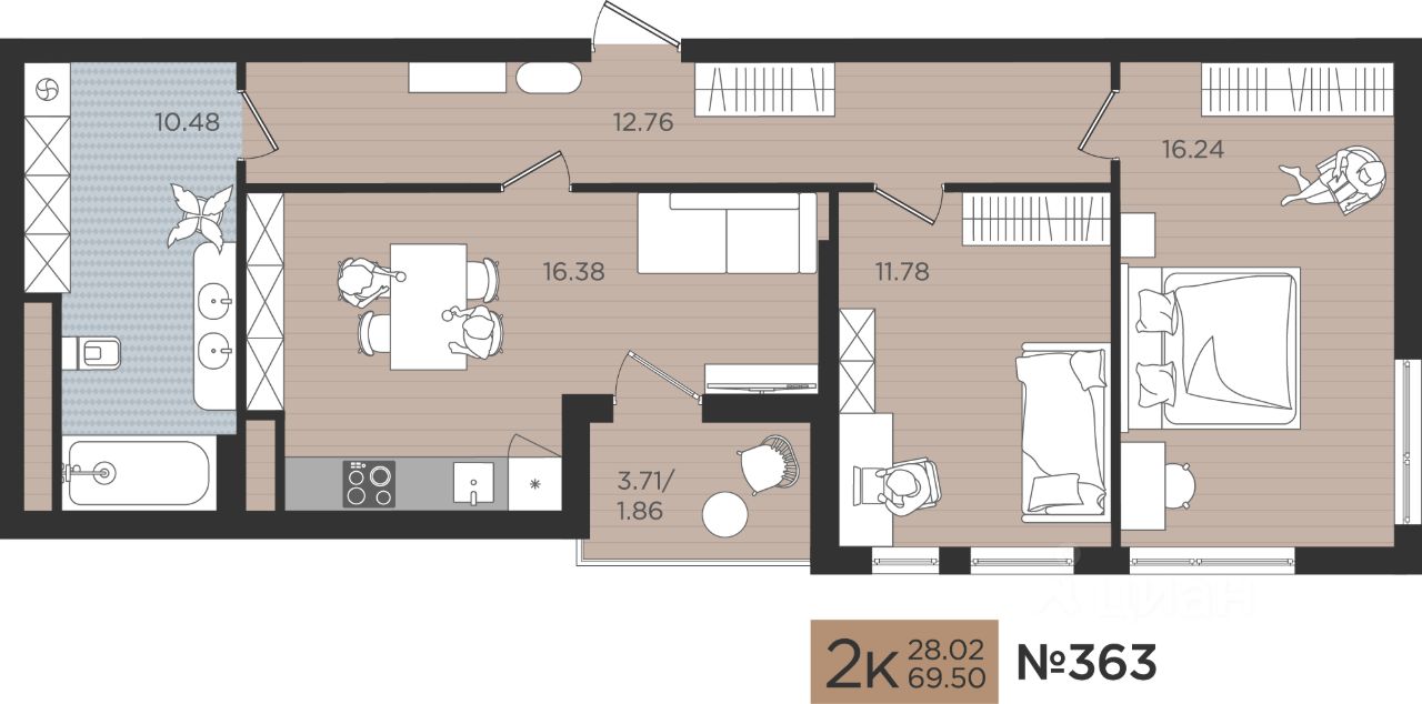 Продаётся комфортабельная 2-комнатная квартира 363 на Советском проспекте, 50 в ЖК "МОЙ ГОРОД"