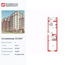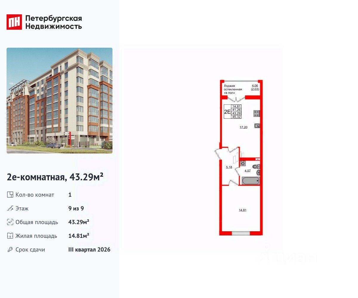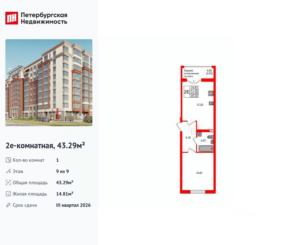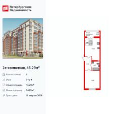 Удобная, классическая, функциональная европланировка, большая кухня-гостиная 17.2 м², просторная прихожая 5.18 м². Общая площадь квартиры - 43.29 м², жилая 14.81 м², высота потолка 3 м.