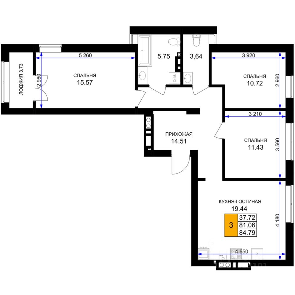 Продаётся 3-комнатная квартира в строящемся доме (Дом 3 (1 очередь)), срок сдачи: I-кв. 2026, общей площадью 84.79 кв.м., на 7 этаже. Новый жилой комплекс "Включи" от застройщика "СпецСтройКубань" расположен в г. Гурьевск в районе Гурьевского шоссе.