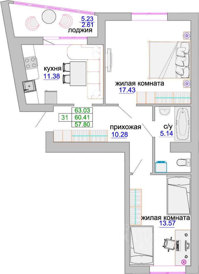 Общая площадь61,3 м²