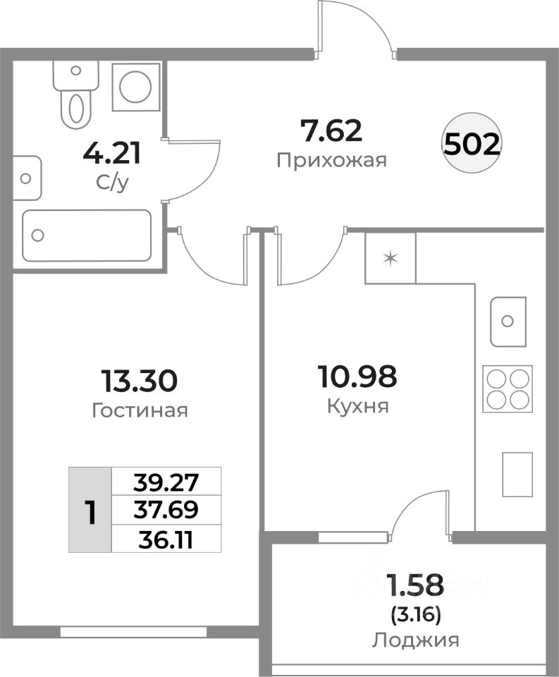 Общая площадь37,69 м²