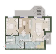 Планировка и эстетика направлены на создание гармоничной и функциональной среды путем разделения на гостевую и личную зоны: удобная кухня интегрирована в общее пространство; гостиная наполнена светом и воздухом благодаря террасе и отдельному балкону, дополнительные удобства в виде гардеробной и 2 ванных комнат.