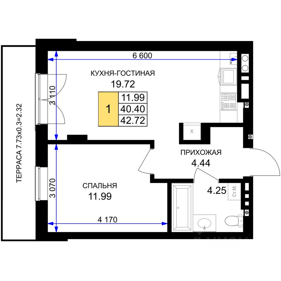 Продаётся 1-комнатная квартира в строящемся доме (Дом 6 (2 очередь)), срок сдачи: I-кв. 2027, общей площадью 42.72 кв.м., на 1 этаже. Новый жилой комплекс "Включи" от застройщика "СпецСтройКубань" расположен в г. Гурьевск в районе Гурьевского шоссе.