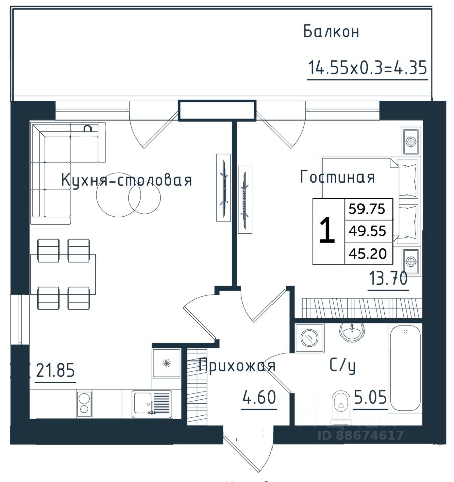 Продаётся 1-комнатная квартира в строящемся доме (Дом 2), срок сдачи: II-кв. 2026, общей площадью 59.75 кв.м., на 4 этаже. Новый жилой комплекс "Янтарные Сезоны" от Группы компаний "Модуль-Стройград" расположен по адресу: Калининградская обл., пгт Янтарный, ул. Советская.