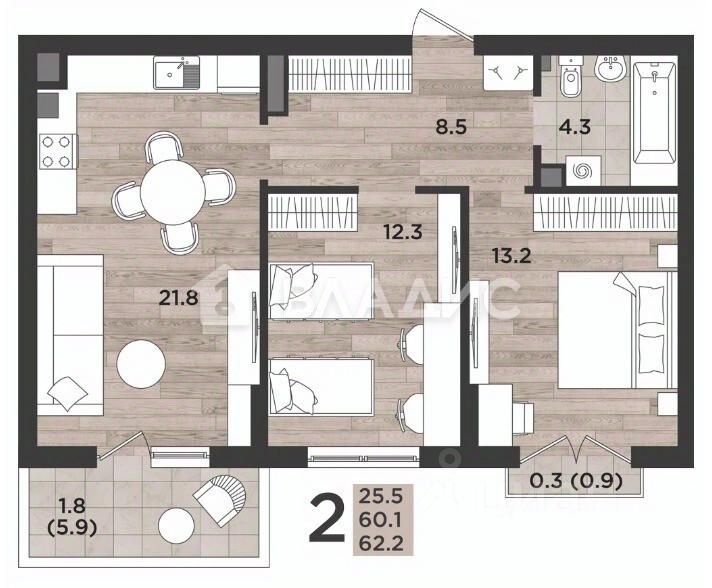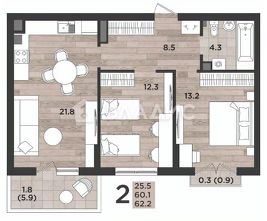 Общая площадь квартиры 62,2 кв. м.