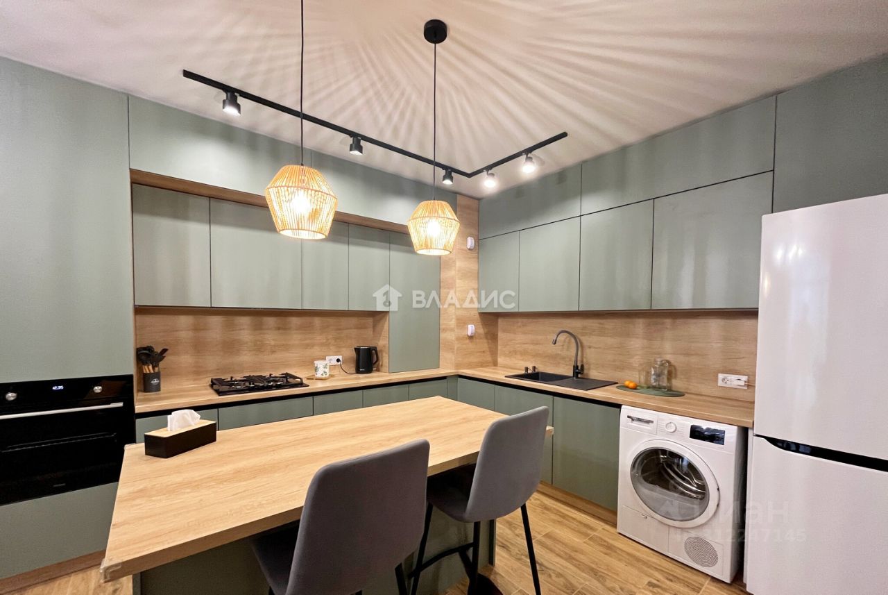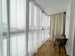 Кухня-гостиная 21,8 кв. м, с выходом на просторную лоджию с панорамным остеклением площадью 5,9 кв. м.