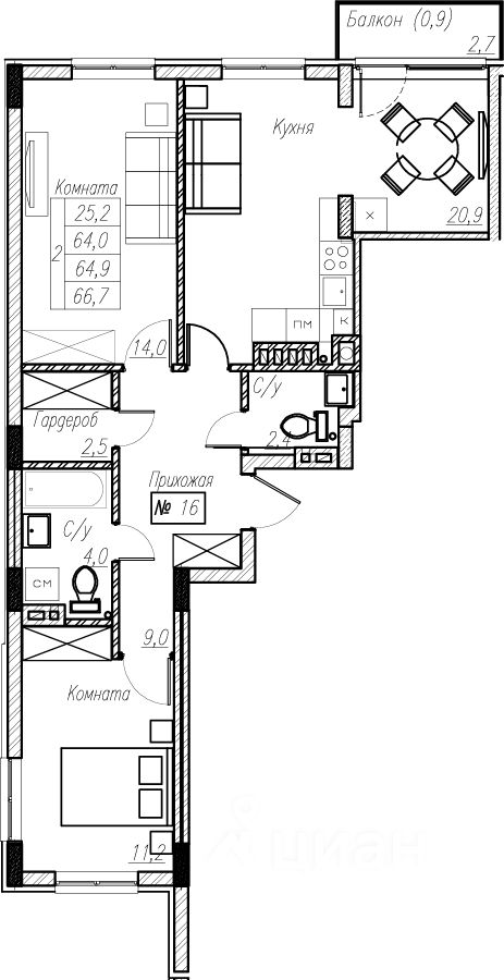 Общая площадь64,9 м²