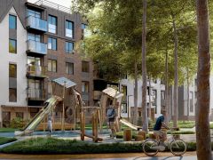 • Во дворе ЖК сохранены взрослые деревья, а территория благоустроена как парк с детскими площадками, беговой дорожкой и зонами отдыха.