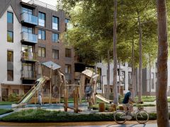 • Во дворе ЖК сохранены взрослые деревья, а территория благоустроена как парк с детскими площадками, беговой дорожкой и зонами отдыха.
