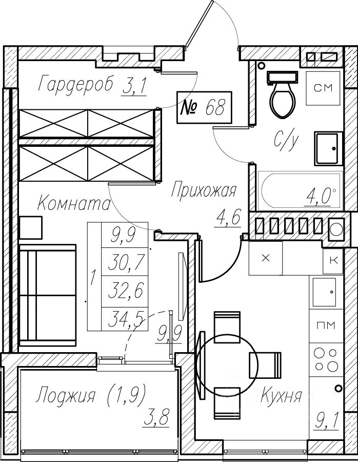 Общая площадь32,6 м²
