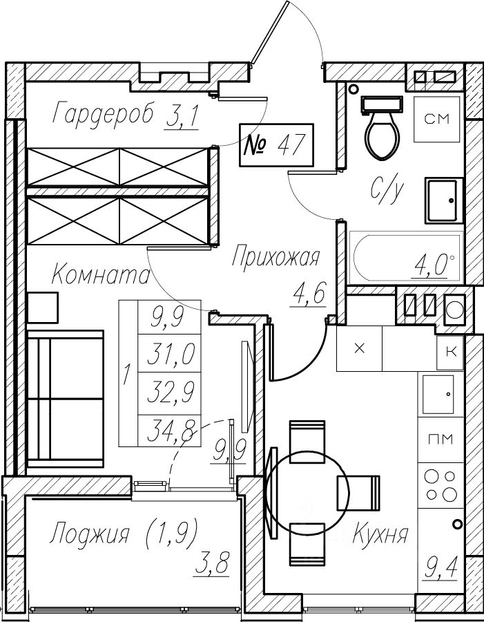 Общая площадь32,9 м²