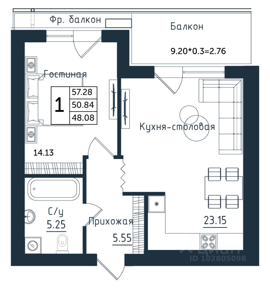 Общая площадь57,28 м²