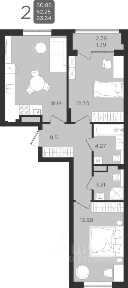двухкомнатные от 60м2, трехкомнатные от 70м2.