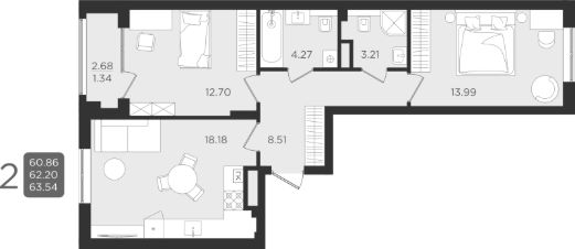 двухкомнатные от 60м2, трехкомнатные от 70м2.