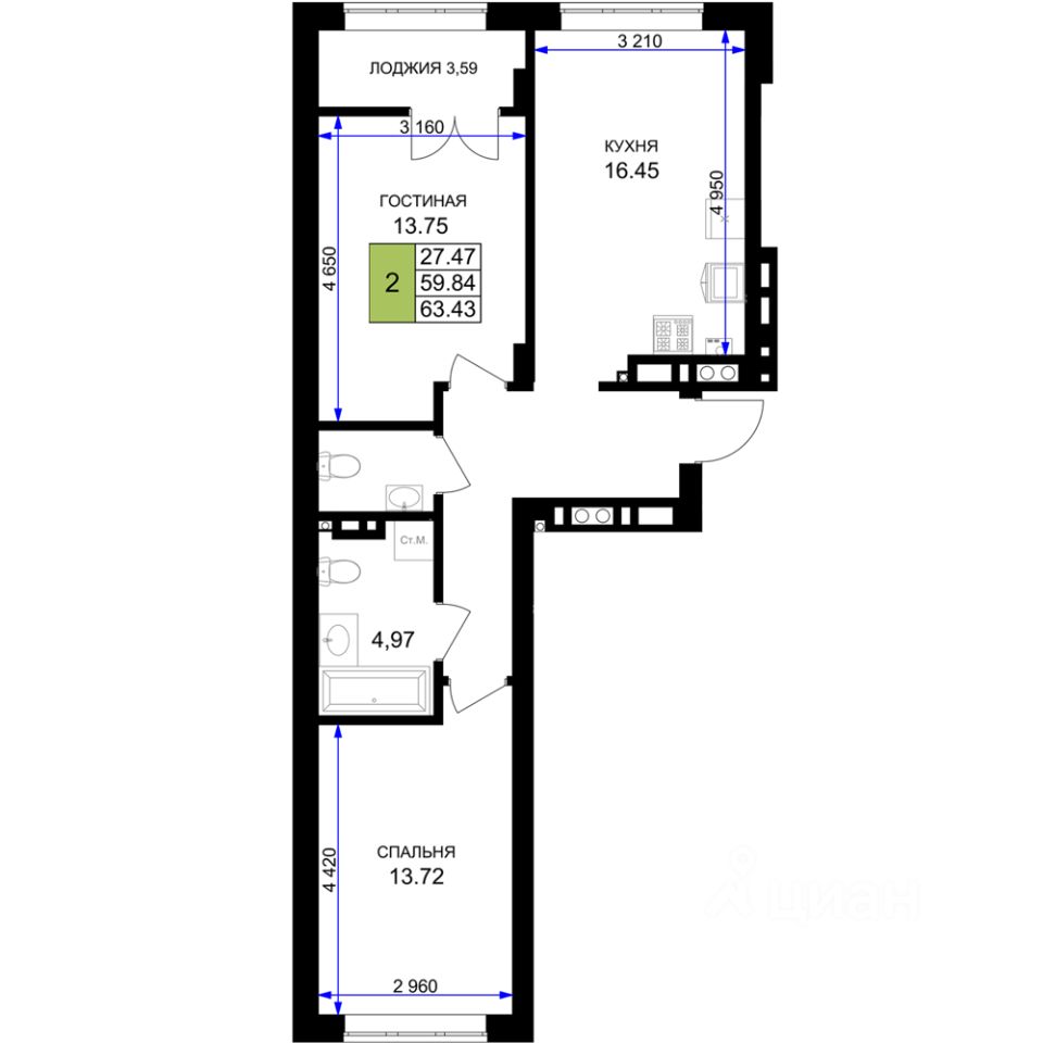 Общая площадь63,43 м²