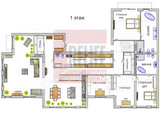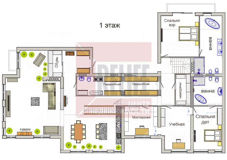 1-уровень: гостиная с каминной зоной 54.9 кв.м, кухня-столовая 32.4 кв.м, детская и взрослая мастер-спальни, просторная гардеробная и гостевой санузел.
