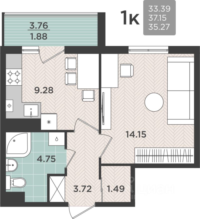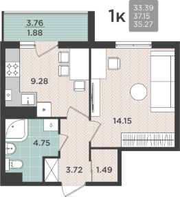 Продаётся 1-комнатная квартира в строящемся доме (Дом 15), срок сдачи: II-кв. 2026, общей площадью 37.15 кв.м., на 1 этаже.