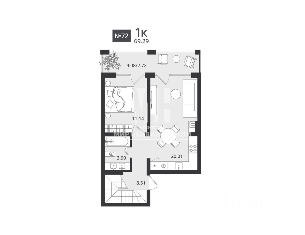• кухня-гостиная - 20,01 кв.м. с выходом на балкон - 9,08 кв.м.