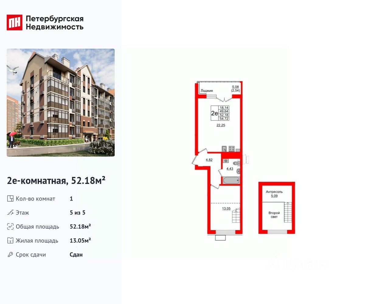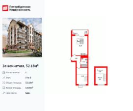 Удобная, классическая, функциональная европланировка, большая кухня-гостиная 22.25 м², просторная прихожая 4.82 м². Общая площадь квартиры - 52.18 м², жилая 13.05 м², высота потолка 3.3 м.