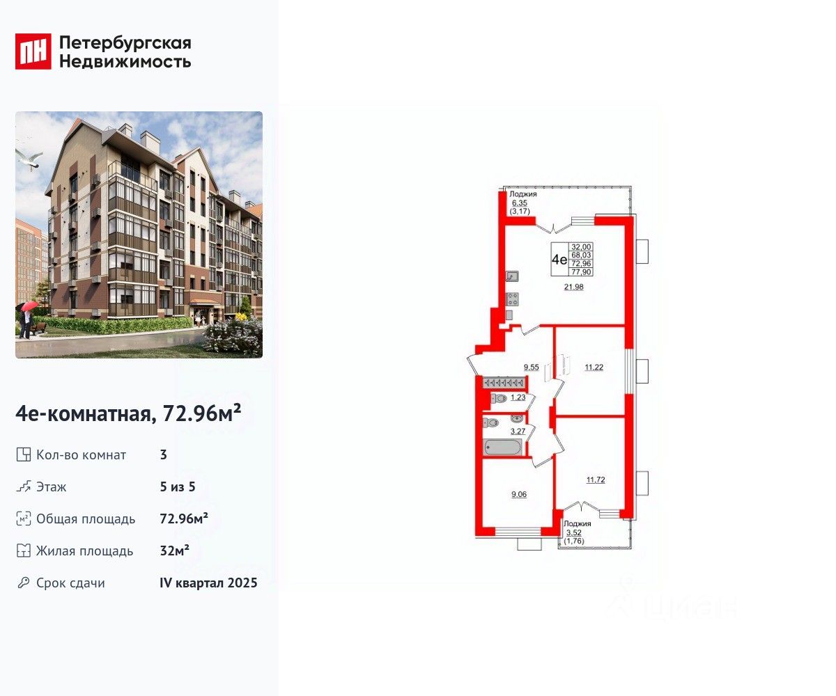 Удобная, классическая, функциональная европланировка, большая кухня-гостиная 21.98 м², вместительная прихожая 9.55 м². Общая площадь квартиры - 72.96 м², жилая 32 м², высота потолка 3.3 м.