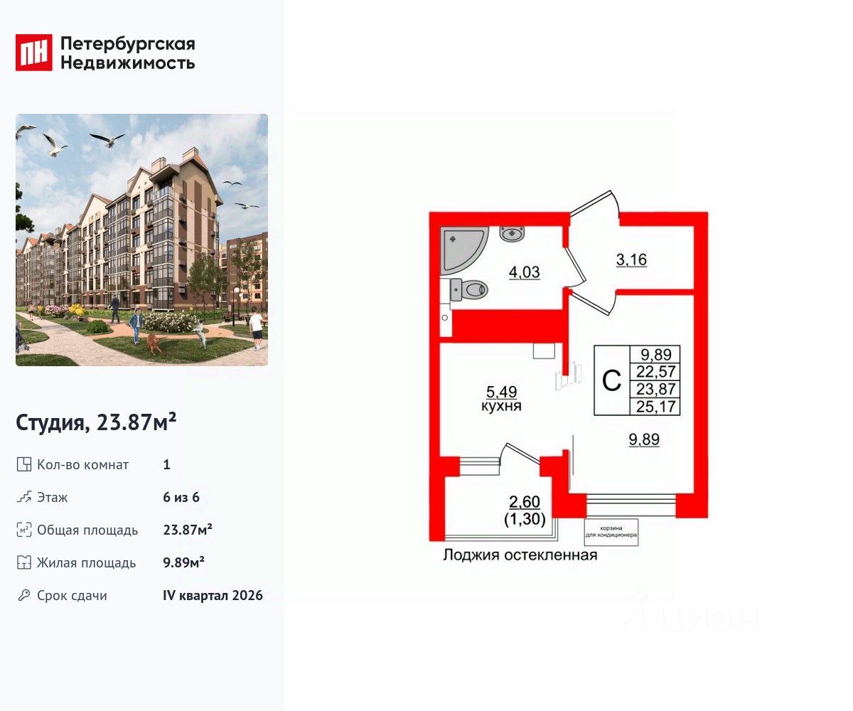 Удобная, классическая, функциональная европланировка, большая кухня-гостиная 5.49 м², вместительная прихожая 3.16 м². Общая площадь студии - 23.87 м², жилая 9.89 м², высота потолка 3.3 м.