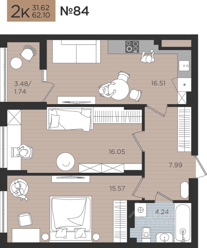 Продается комфортабельная 2 комнатная квартира 84 на Советском проспекте, 50 в ЖК "МОЙ ГОРОД"