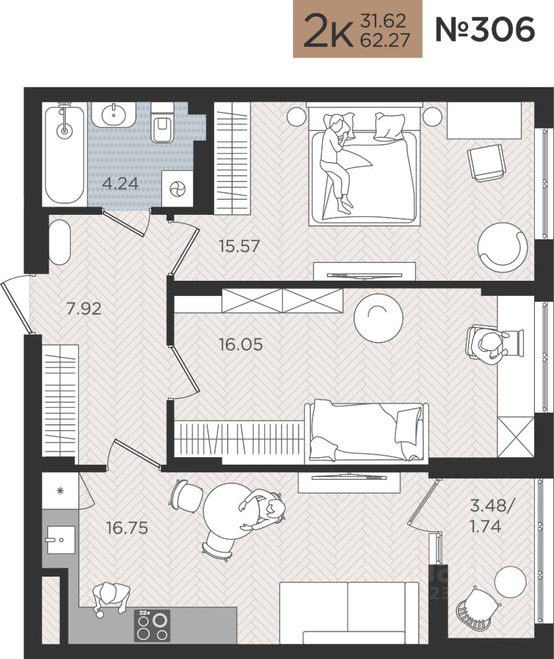 Продается комфортабельная 2 комнатная квартира 306 на Советском проспекте, 50 в ЖК "МОЙ ГОРОД"