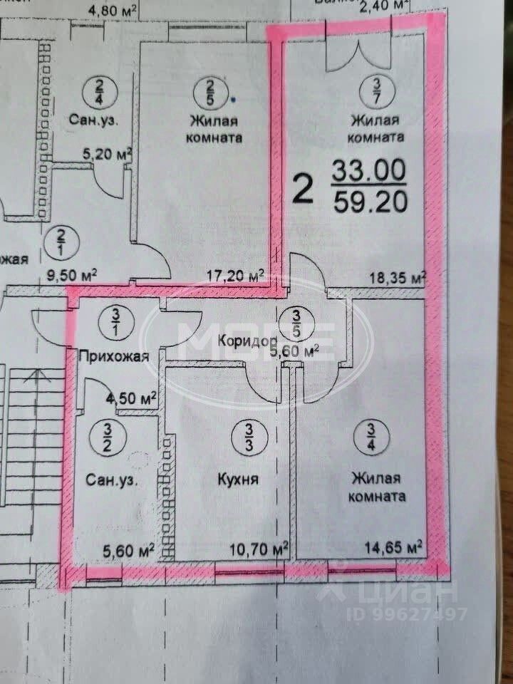 Дом построен в 2016 году из блоков, перекрытия железобетонные. Отопление центральное. Общая площадь квартиры составляет 59,5 кв. м, из которых 33 кв. м — жилая площадь, а 10,7 кв. м занимает кухня. Высота потолков — 2,5 метра. Евроремонт, окна выходят во двор.