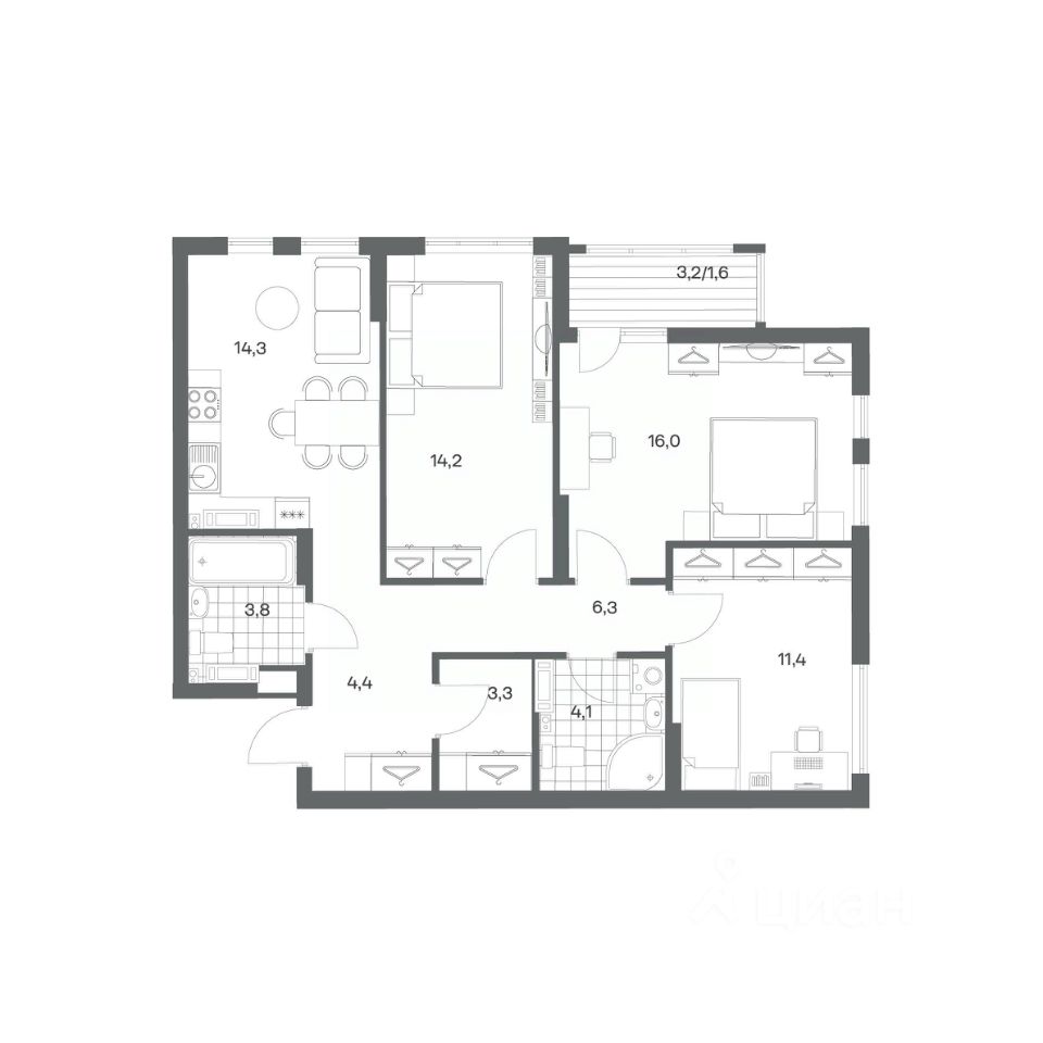 в Гагарина 30 от компании ГК "ТРЕСТ". Площадь кухни 14.3 м². Жилой комплекс комфорт-класса "Гагарина 30" расположен в Ленинградском районе Калининграда на улице Юрия Гагарина. Жилой комплекс включает в себя три корпуса высотой 9-18 этажей. Срок сдачи намечен на 1 квартал 2028 года.