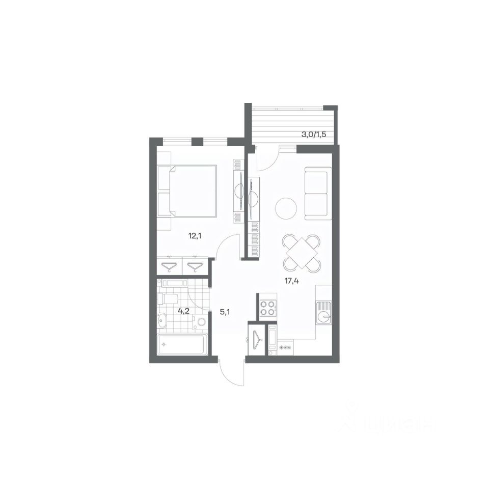 в Гагарина 30 от компании ГК "ТРЕСТ". Площадь кухни 17.4 м². Жилой комплекс комфорт-класса "Гагарина 30" расположен в Ленинградском районе Калининграда на улице Юрия Гагарина. Жилой комплекс включает в себя три корпуса высотой 9-18 этажей. Срок сдачи намечен на 1 квартал 2028 года.