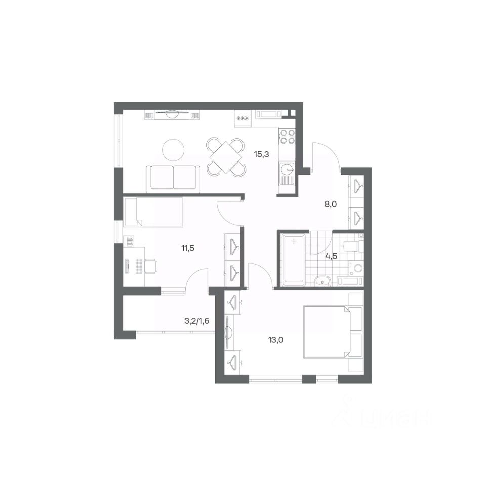 в Гагарина 30 от компании ГК "ТРЕСТ". Площадь кухни 15.3 м². Жилой комплекс комфорт-класса "Гагарина 30" расположен в Ленинградском районе Калининграда на улице Юрия Гагарина. Жилой комплекс включает в себя три корпуса высотой 9-18 этажей. Срок сдачи намечен на 1 квартал 2028 года.