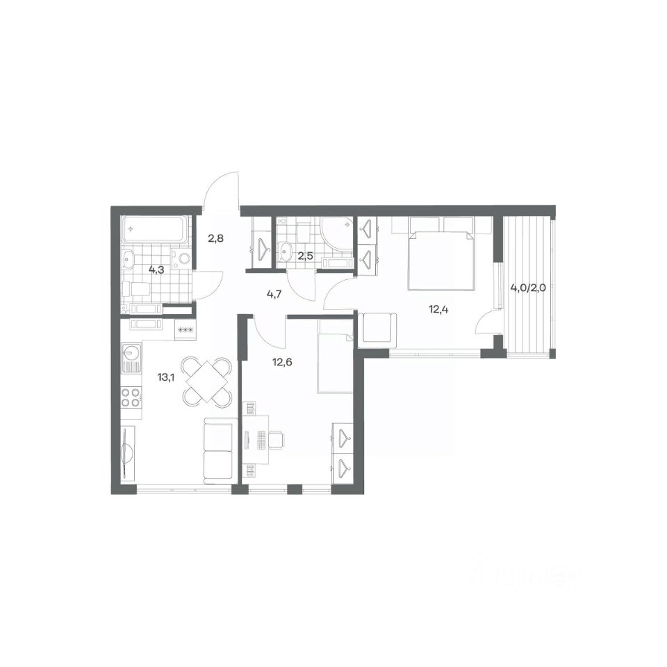 в Гагарина 30 от компании ГК "ТРЕСТ". Площадь кухни 13.1 м². Жилой комплекс комфорт-класса "Гагарина 30" расположен в Ленинградском районе Калининграда на улице Юрия Гагарина. Жилой комплекс включает в себя три корпуса высотой 9-18 этажей. Срок сдачи намечен на 1 квартал 2028 года.