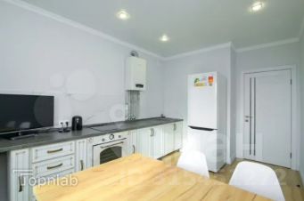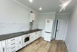 Кухня укомплектована встроенной мебелью и современными бытовыми приборами, включая плиту, холодильник и микроволновую печь.