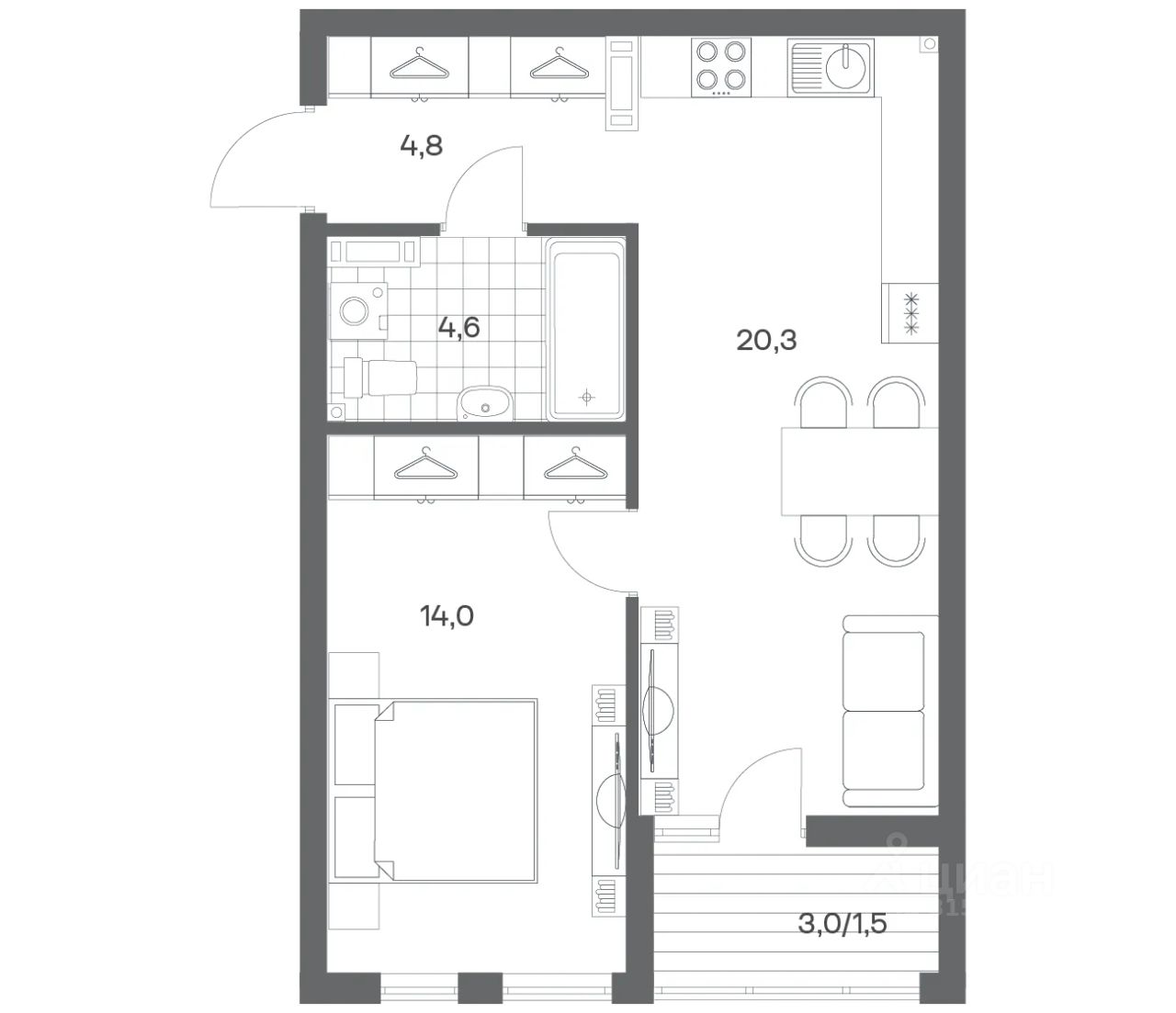 в Гагарина 30 от компании ГК "ТРЕСТ". Площадь кухни 20.3 м². Жилой комплекс комфорт-класса "Гагарина 30" расположен в Ленинградском районе Калининграда на улице Юрия Гагарина. Жилой комплекс включает в себя три корпуса высотой 9-18 этажей. Срок сдачи намечен на 1 квартал 2028 года.