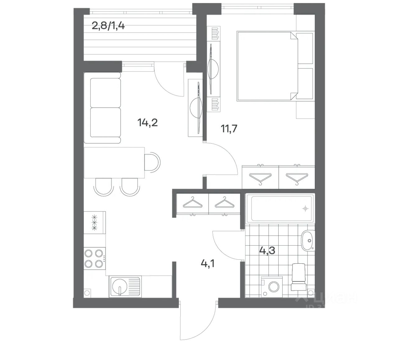 в Гагарина 30 от компании ГК "ТРЕСТ". Площадь кухни 14.2 м². Жилой комплекс комфорт-класса "Гагарина 30" расположен в Ленинградском районе Калининграда на улице Юрия Гагарина. Жилой комплекс включает в себя три корпуса высотой 9-18 этажей. Срок сдачи намечен на 1 квартал 2028 года.