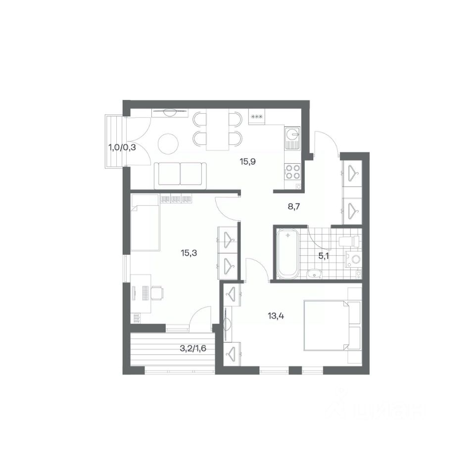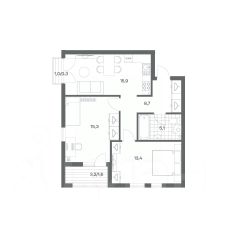 в Гагарина 30 от компании ГК "ТРЕСТ". Площадь кухни 15.9 м². Жилой комплекс комфорт-класса "Гагарина 30" расположен в Ленинградском районе Калининграда на улице Юрия Гагарина. Жилой комплекс включает в себя три корпуса высотой 9-18 этажей. Срок сдачи намечен на 1 квартал 2028 года.