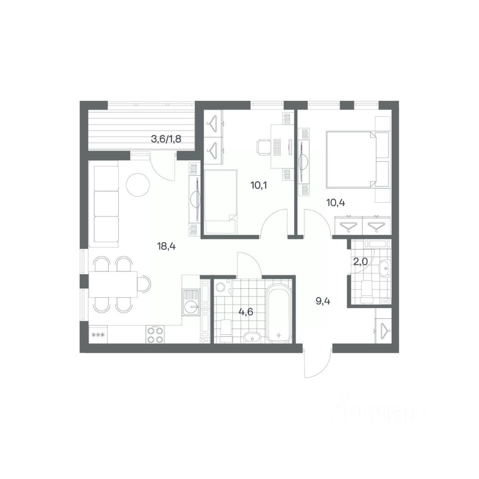 в Гагарина 30 от компании ГК "ТРЕСТ". Площадь кухни 18.4 м².  Жилой комплекс комфорт-класса "Гагарина 30" расположен в Ленинградском районе Калининграда на улице Юрия Гагарина. Жилой комплекс включает в себя три корпуса высотой 9-18 этажей. Срок сдачи намечен на 1 квартал 2028 года.