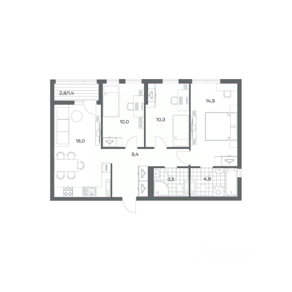 в Гагарина 30 от компании ГК "ТРЕСТ". Площадь кухни 18 м². Жилой комплекс комфорт-класса "Гагарина 30" расположен в Ленинградском районе Калининграда на улице Юрия Гагарина. Жилой комплекс включает в себя три корпуса высотой 9-18 этажей. Срок сдачи намечен на 1 квартал 2028 года.