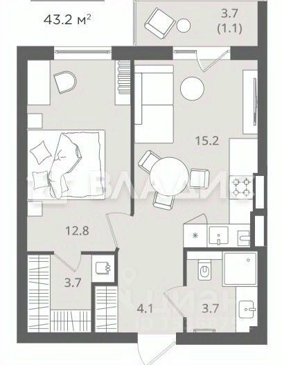 Квартира в отделке "белый ключ", что позволит вам создать интерьер по своему вкусу. Общая площадь квартиры — 43,2 квадратных метра, из них жилая площадь составляет 12,8 квадратных метров, а площадь кухни — 15,2 квадратных метров.
