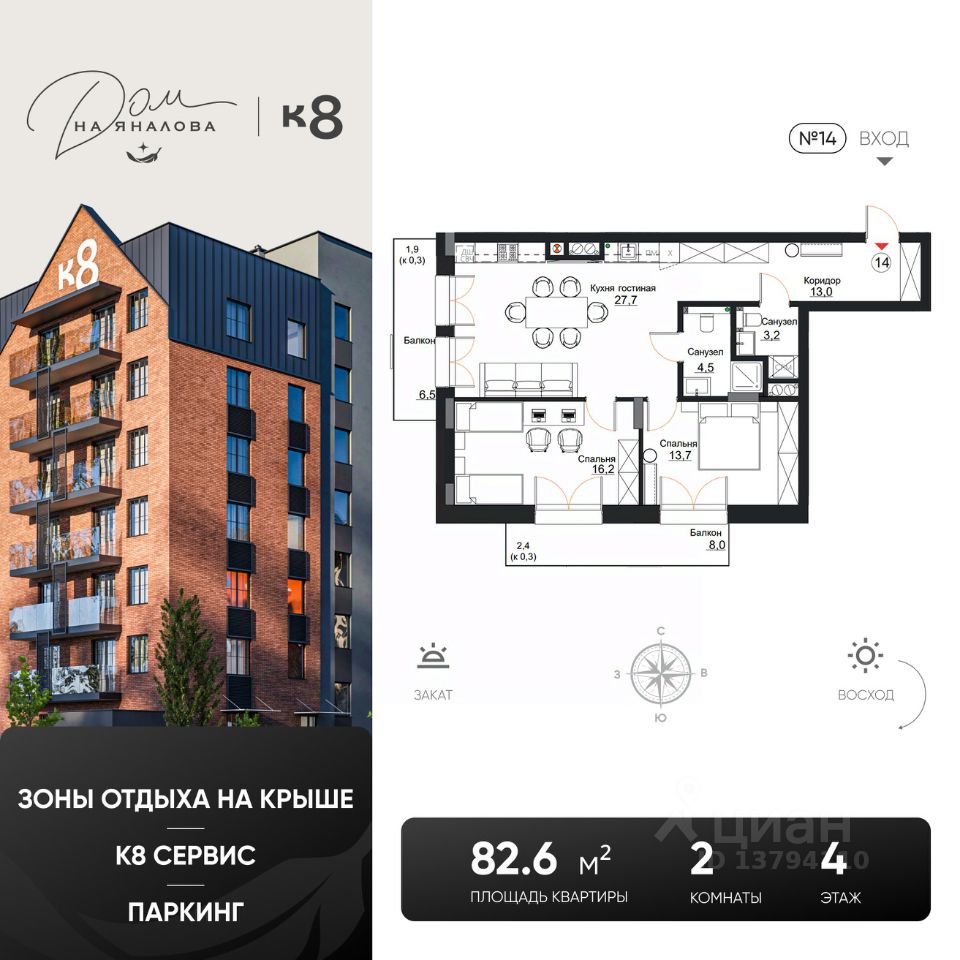 Акция "Черная пятница в К8 Х8". Цена действует только при 100% оплате (в т.ч. при ипотеке без субсидирования) или рассрочке до 6 месяцев при первоначальном взносе от 50%. Срок действия акции: 08.11.25-07.12.25, в данный период необходимо произвести оплату, не является публичной офертой, предложение ограничено. "Дом на Яналова" это не просто недвижимость, а инвестиция в комфортную и безопасную жизнь в престижном районе города с отличной транспортной доступностью и развитой инфраструктурой. ОСНОВНЫЕ ПАРАМЕТРЫ • Клубный дом (84 квартиры) • Монолитно-каркасная технология строительства • Подземный паркинг на 48 машино-мест • И еще 16 машино-мест во дворе ИНЖЕНЕРНЫЕ РЕШЕНИЯ: • Звукоизоляция до 55 дБ (как в 5-звездочных отелях) • Индивидуальное кондиционирование • Дополнительная фильтрация воды • Система ионизации воздуха ЛОКАЦИЯ: • Престижный район города • 35 минут до моря на автомобиле • Развитая инфраструктура • Зеленый двор КОМФОРТНЫЕ РЕШЕНИЯ • Дизайнерская отделка холлов и лестничных маршей • Отделка квартир White Box • Поддержание микроклимата • Бесшумные лифты • Эксплуатируемая кровля с зонами отдыха • Собственная сервисная компания БЕЗОПАСНОСТЬ: • Охраняемая территория • Закрытый двор • Умные системы доступа ООО "Специализированный застройщик "СпецСтрой" Акция не суммируется ни с какими другими акциями на сайте. Все акции, кроме "Черной пятницы", "Спец.цена на данный лот", "К8 дарит подарки" рассчитываются от базовой стоимости.