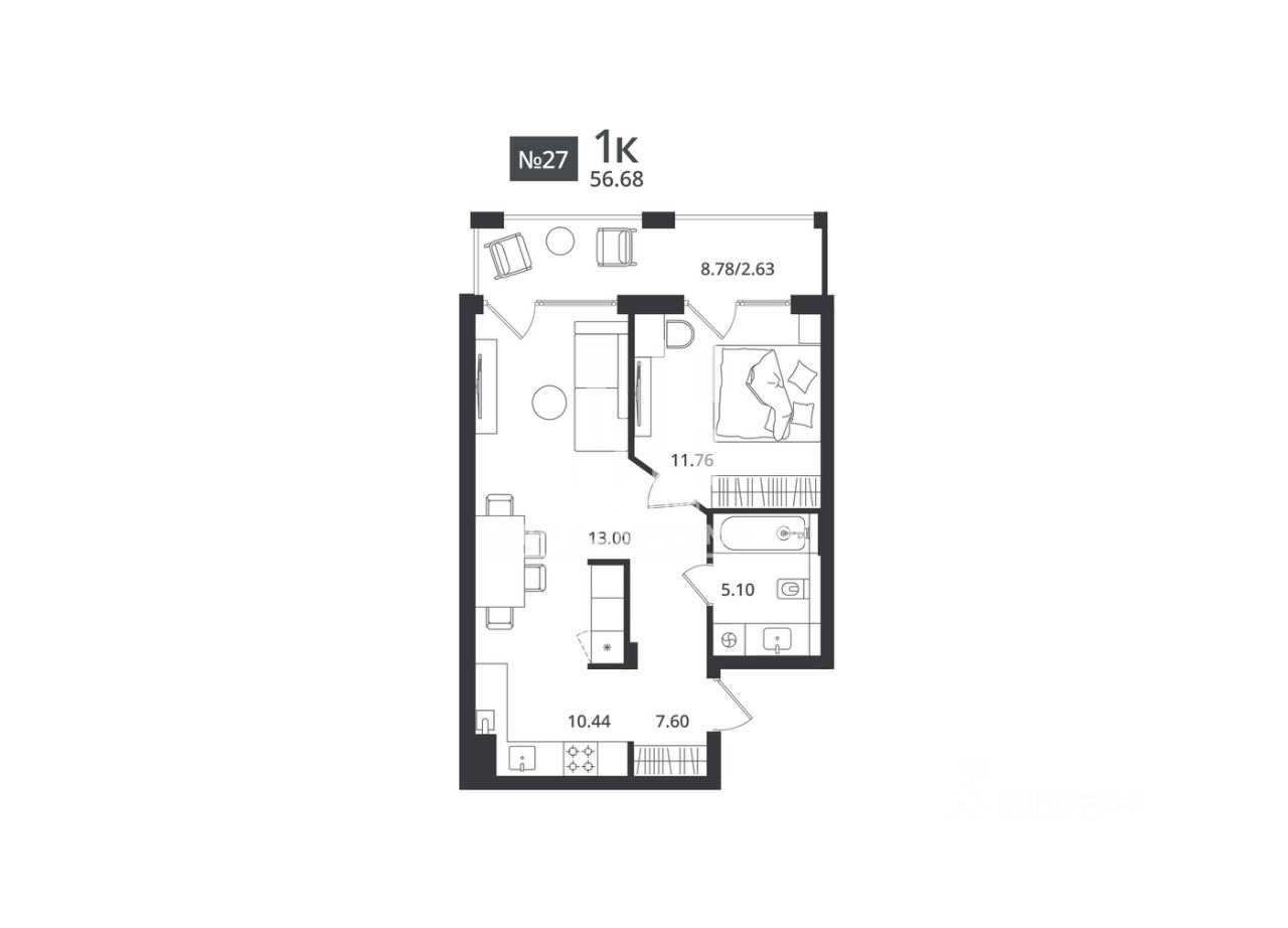 Удачное планировочное решение позволяет организовать комфортное пространство из видовой спальни и просторной гостиной площадью 13,00 кв.м.