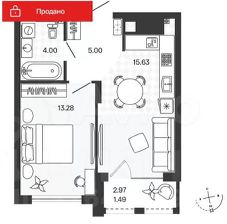 Общая площадь квартиры составляет 41 кв. м, жилая площадь — 13.2 кв. м, а просторная кухня — 15.6 кв. м.