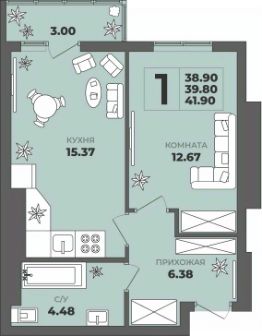 Продаётся 1-комнатная квартира в строящемся доме (Дом 2), срок сдачи: II-кв. 2027, общей площадью 39.8 кв.м., на 8 этаже. ЖК "ГРИНВУД".